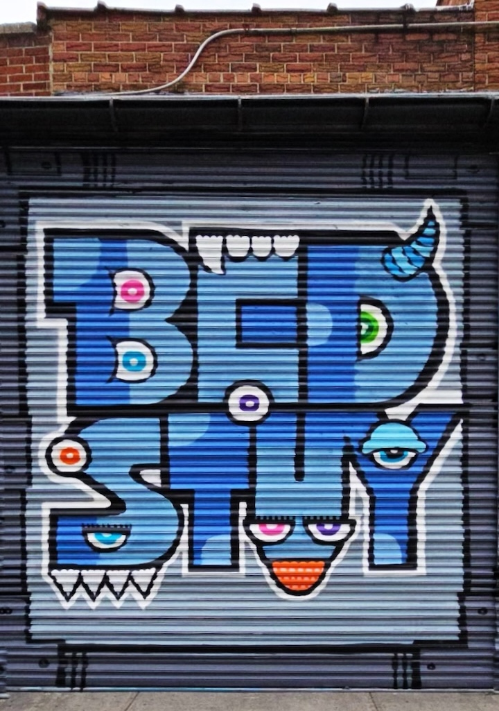Founded and curated by Miki Mu and Frankie Velez, the BedStuy Walls Mural Festival has for the fouth consecutive year transformed Lexington Avenue between Stuyvesant and Lewis Streets and beyond into a dazzling open-air gallery, while actively engaging the local community. The brightly-hued mural featured above was painted by UK native Klonism and Queens-based Turtle Caps. Several more images of murals — painted by local, national and international artists — follow.