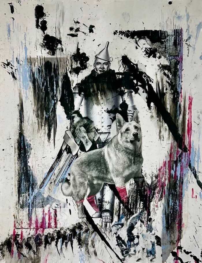 The artist and activist, Appleton, beneath “Toto Has a Day Job” from his “A New Hero Emerges” series and the stirring mixed media work — pictured above — from his “Little Girl Blue” series