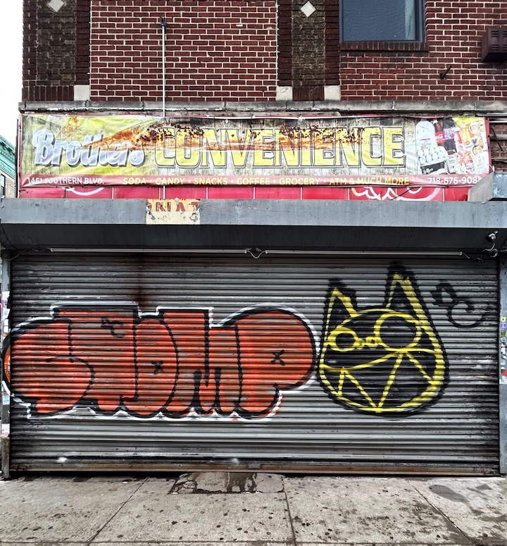 The rappel graffiti featured above was fashioned in the Bronx by Mad Vaillan, Dzel and Fumi. What follows are several more images of unsanctioned artworks — in our ongoing series, “Pushing It Forward” — that have made their way to Bronx open spaces.