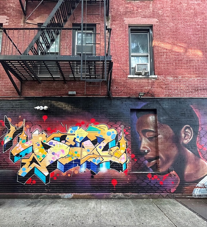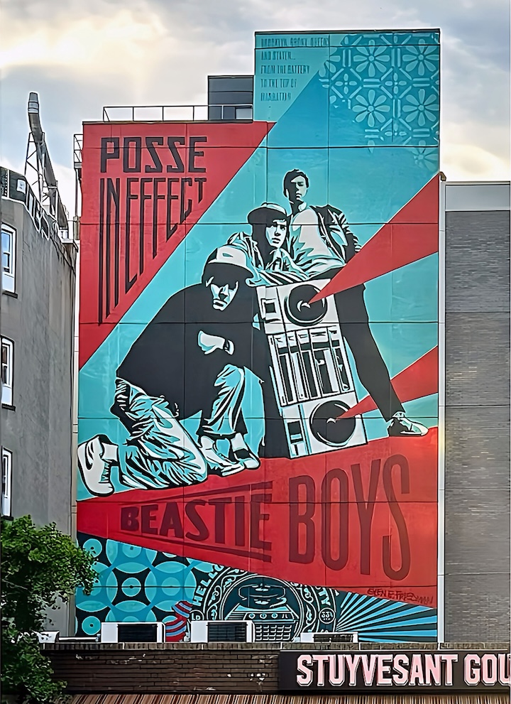 Featured above is Shepard Fairey‘s tribute to the legendary Beastie Boys. Still looming large over East 14th Street, it was facilitated by the Lisa Project NYC back in 2023. Several more images of guys on NYC walls follow: