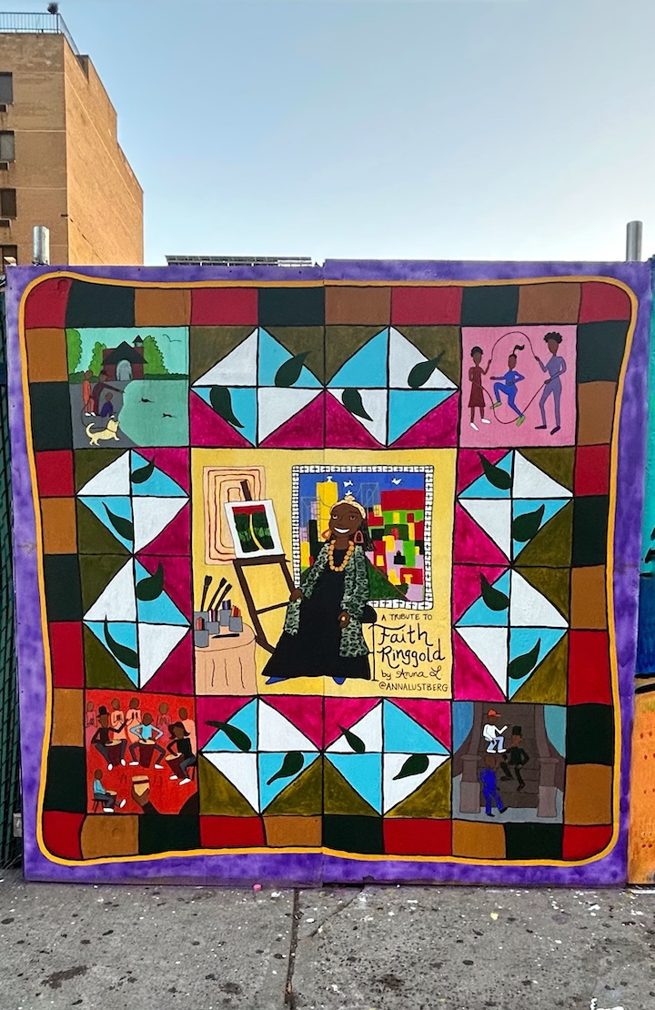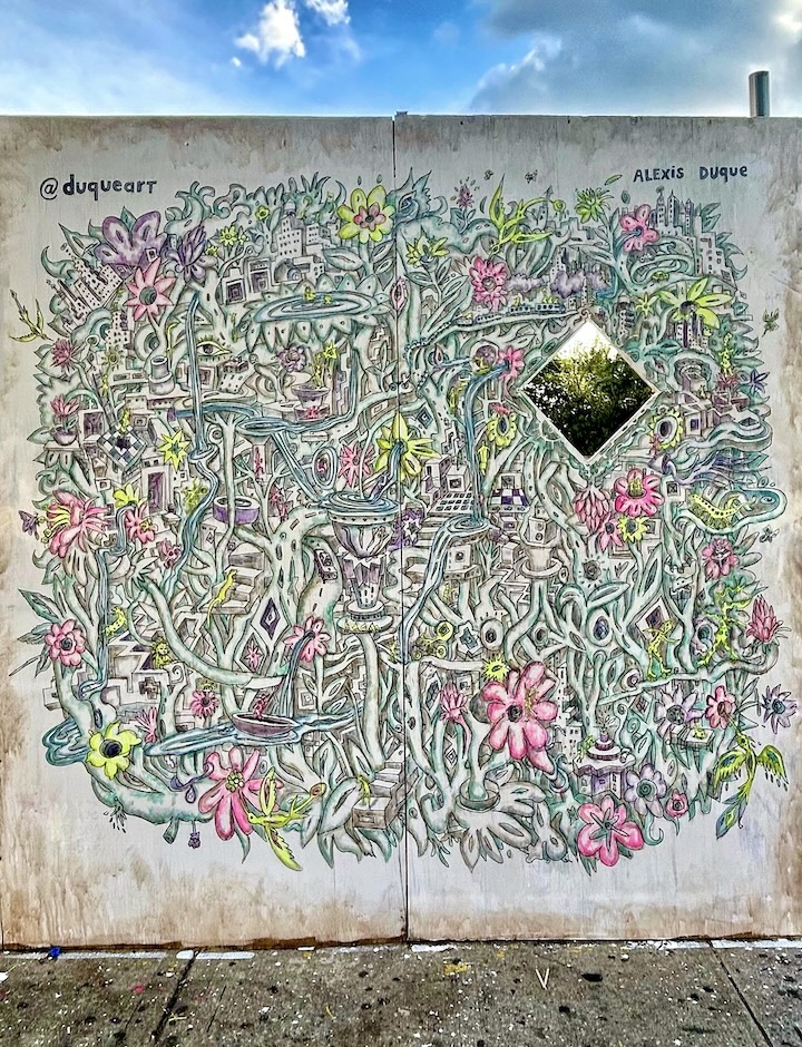 East Harlem-based, Stockholm-born artist Scratch posing to the right of her mural with NYC-based Japanese artist Shiro One hovering above