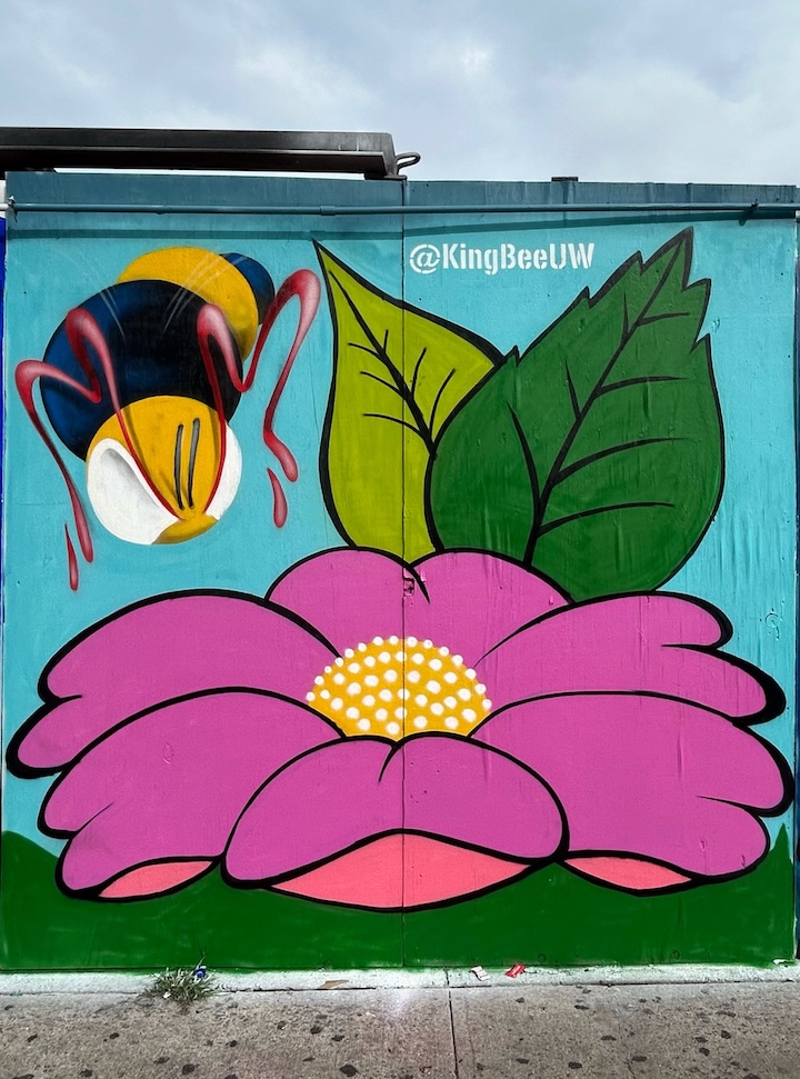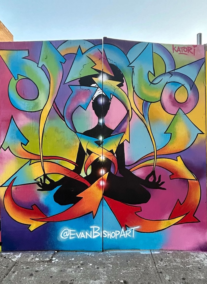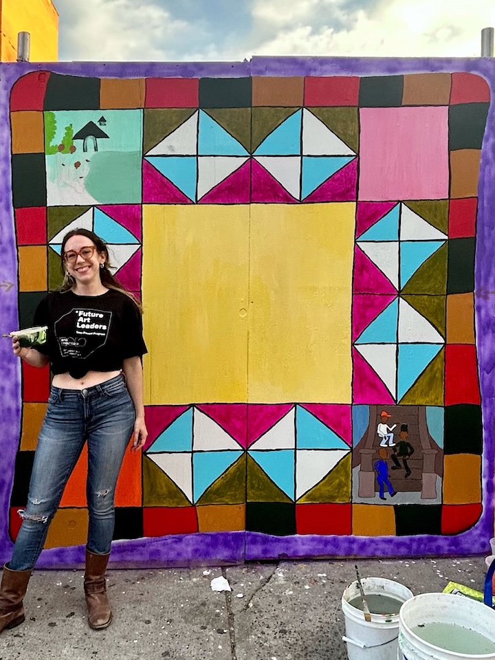 Austin, Texas-based mixed-media artist WinkStyles posing beneath her distinctly delightful graffiti-inspired design
