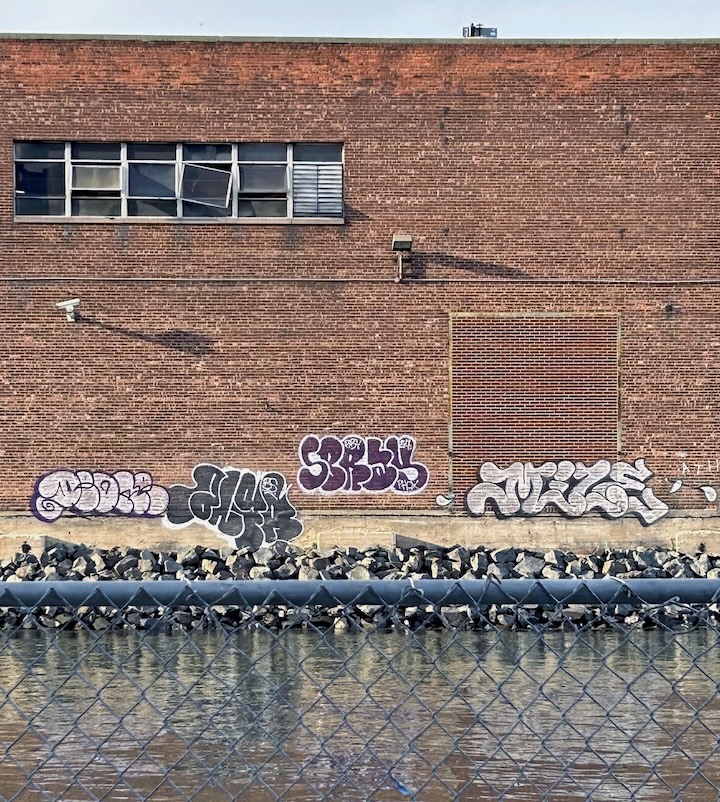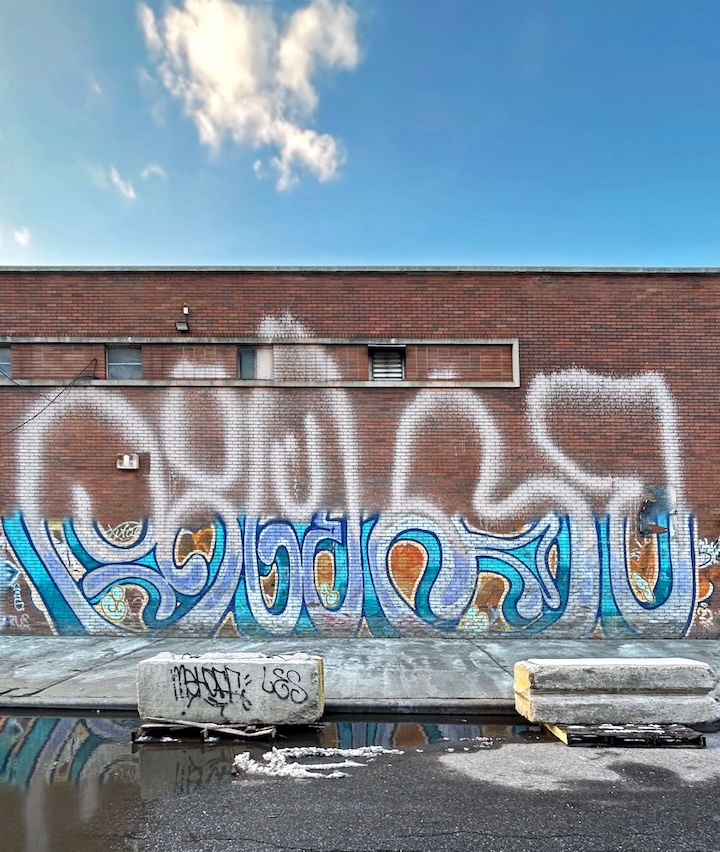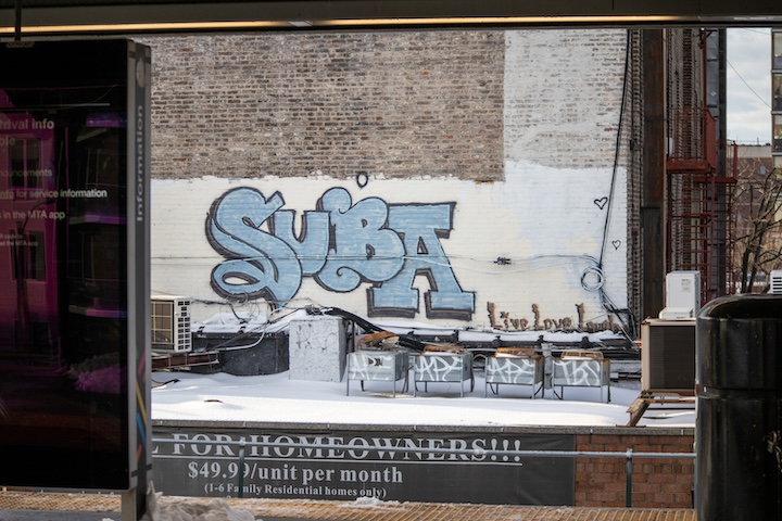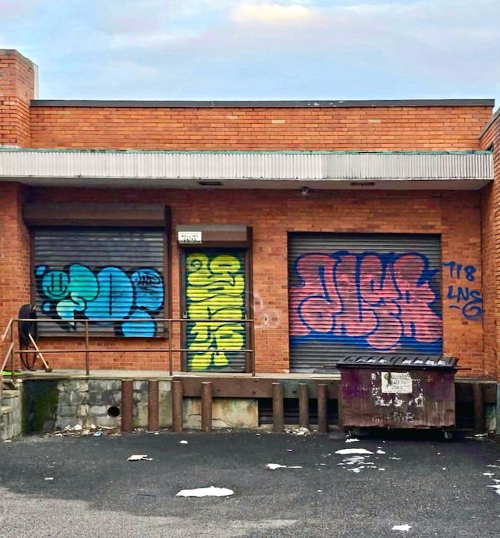 The rappel graffiti featured above was painted in Ridgewood, Queens by the masterly artists Exr and Fumi. What follows are several more images of unsanctioned artworks — in our ongoing series, “Pushing It Forward” — that have made their way onto Queens’ open spaces.